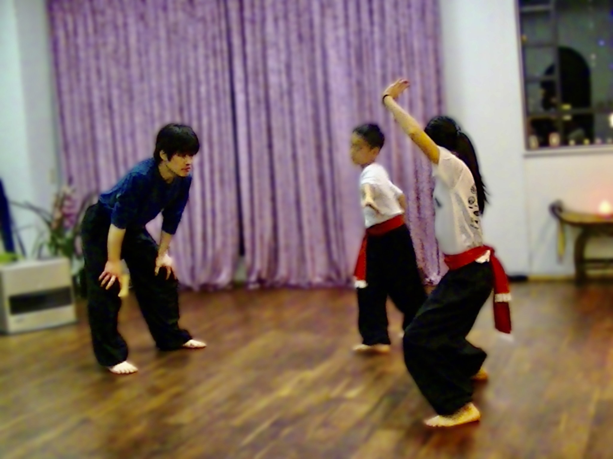 教室では基本練習を中心にカンフーの型を覚えていき、素手の拳法だけではなく棍棒や中国刀などの伝統的な武器を使った型も練 習していきます。カンフーの動きはは幅広い運動方法のある全身運動です。 中腰姿勢の動作から体を伸びやかに使い蹴りを繰り出したり、 そして時には跳躍して職ったりします。 もちろん個人差もありますので、できる、 できないは基本的には問いません。大事なのは「 できるようなるために練習すること」 を心がけて練習しております。